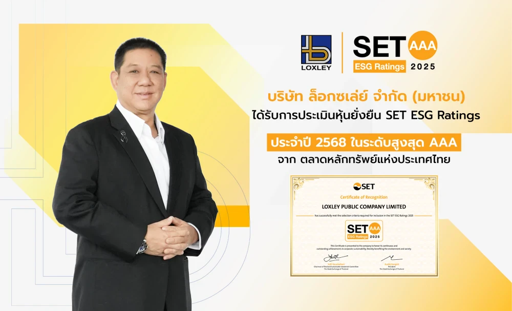 Loxley Public Company Limited (LOXLEY) has successfully passed the SET ESG Ratings assessment for 2025 for the second consecutive year, achieving an “AAA” rating, the highest level awarded by the Stock Exchange of Thailand (SET), as of 12 December 2025. In addition, the Company was selected as a Showcase: SET ESG Ratings 2025 in the Services sector, recognized for its comprehensive and effective approach to sustainable business management.